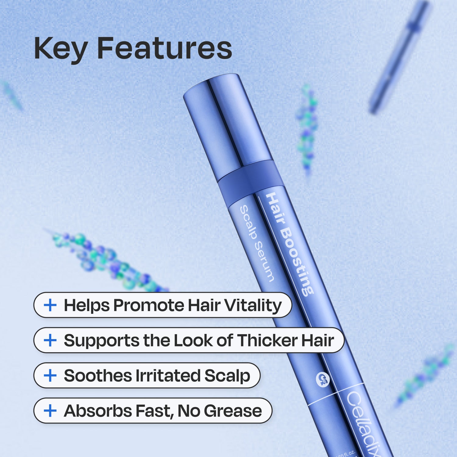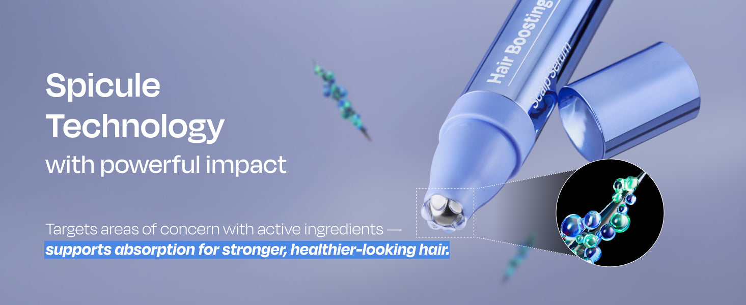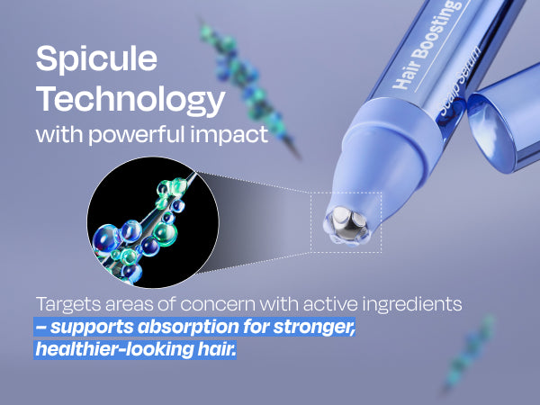 Spicule with Hyaluronic Acid & PanthenolMicro-needle shaped spicule helps enhance absorption of key ingredients like hyaluronic acid and panthenol through micro-channels, promoting effective scalp hydration and care.